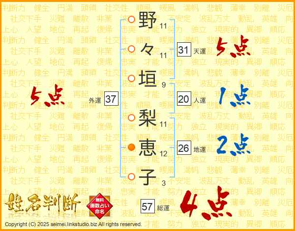 野(11画)々(11画)垣(9画) 梨(11画)恵(12画)子(3画)
