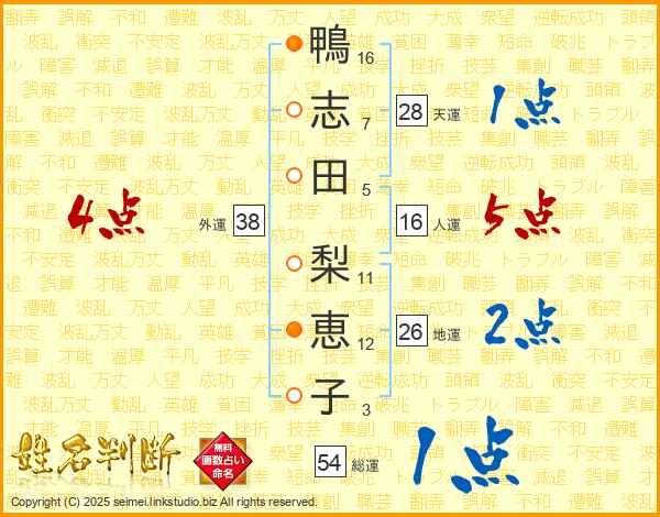 鴨(16画)志(7画)田(5画) 梨(11画)恵(12画)子(3画)