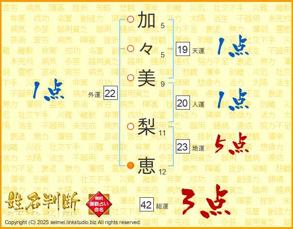 加(5画)々(5画)美(9画) 梨(11画)恵(12画)