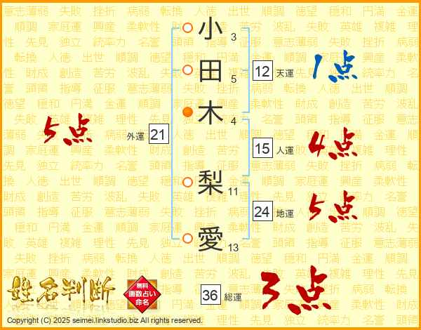 小(3画)田(5画)木(4画) 梨(11画)愛(13画)