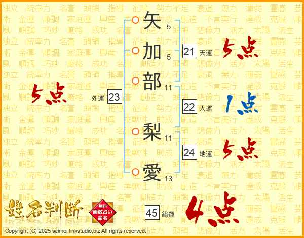 矢加部梨愛さんの総運は45画の4点!