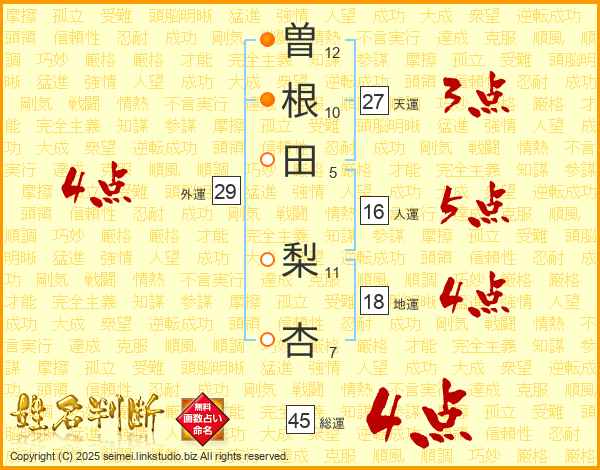 曽(12画)根(10画)田(5画) 梨(11画)杏(7画)