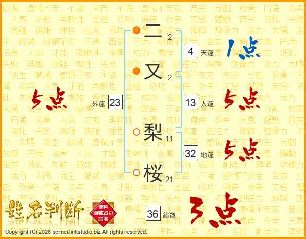 生活面を象徴する運勢です。外部から受ける影響力を表し、結婚運、家庭運や職場、環境への順応性を表します。総運から人運を引いた画数。姓や名が1文字の場合を除く。