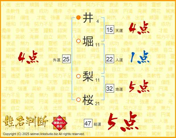 井堀梨桜さんの総運は47画の5点!