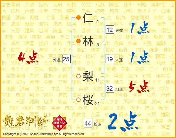 仁(4画)林(8画) 梨(11画)桜(21画)