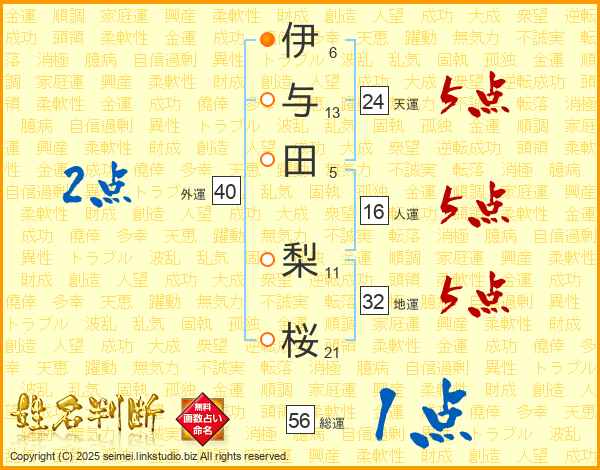 伊(6画)与(13画)田(5画) 梨(11画)桜(21画)