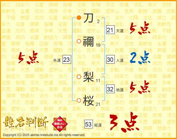 刀(2画)禰(19画) 梨(11画)桜(21画)