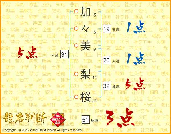 加(5画)々(5画)美(9画) 梨(11画)桜(21画)