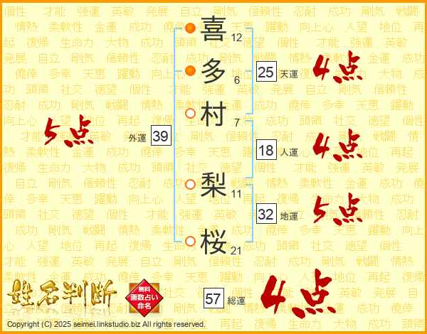 喜(12画)多(6画)村(7画) 梨(11画)桜(21画)