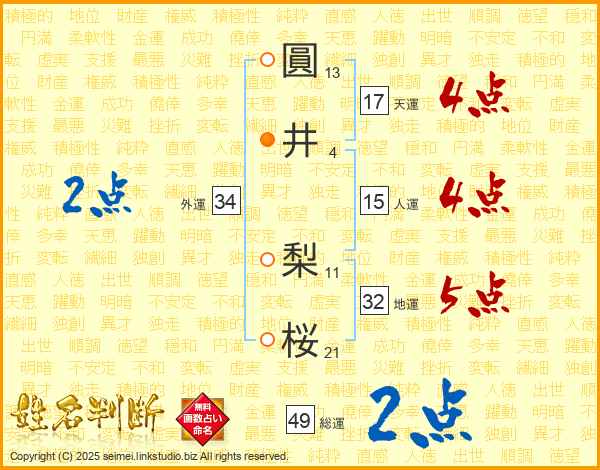 圓(13画)井(4画) 梨(11画)桜(21画)