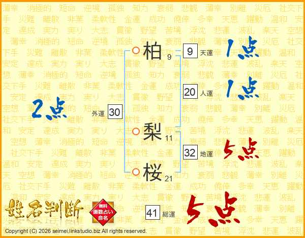柏梨桜さんの総運は41画の5点!