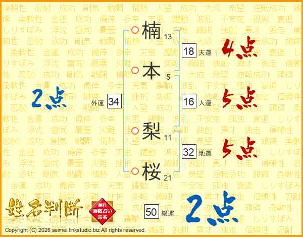 楠(13画)本(5画) 梨(11画)桜(21画)