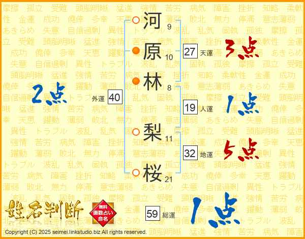 河(9画)原(10画)林(8画) 梨(11画)桜(21画)
