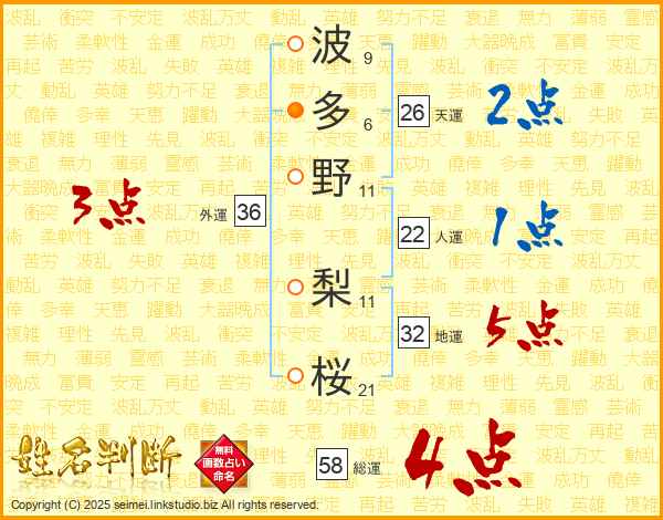 波(9画)多(6画)野(11画) 梨(11画)桜(21画)