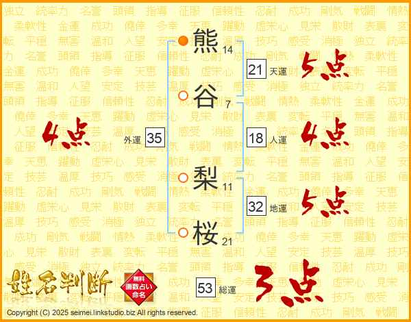熊(14画)谷(7画) 梨(11画)桜(21画)