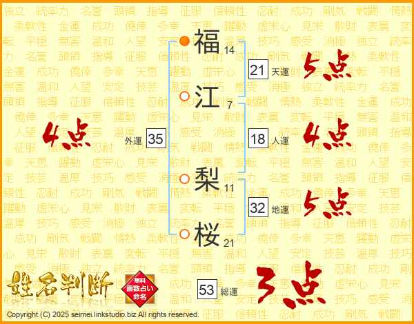 生活面を象徴する運勢です。外部から受ける影響力を表し、結婚運、家庭運や職場、環境への順応性を表します。総運から人運を引いた画数。姓や名が1文字の場合を除く。
