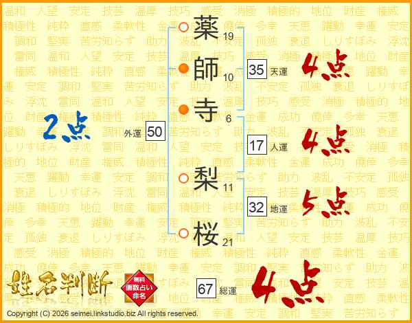 薬(19画)師(10画)寺(6画) 梨(11画)桜(21画)