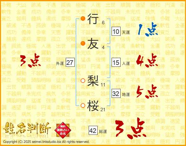 生活面を象徴する運勢です。外部から受ける影響力を表し、結婚運、家庭運や職場、環境への順応性を表します。総運から人運を引いた画数。姓や名が1文字の場合を除く。