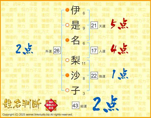 伊是名梨沙子さんの総運は43画の2点!