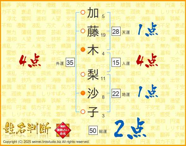 加(5画)藤(19画)木(4画) 梨(11画)沙(8画)子(3画)