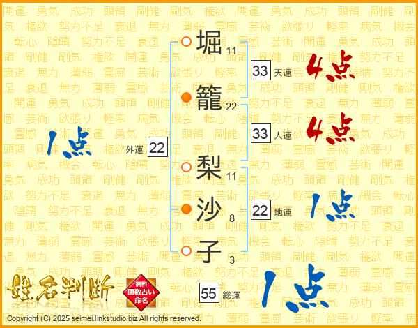 堀(11画)籠(22画) 梨(11画)沙(8画)子(3画)