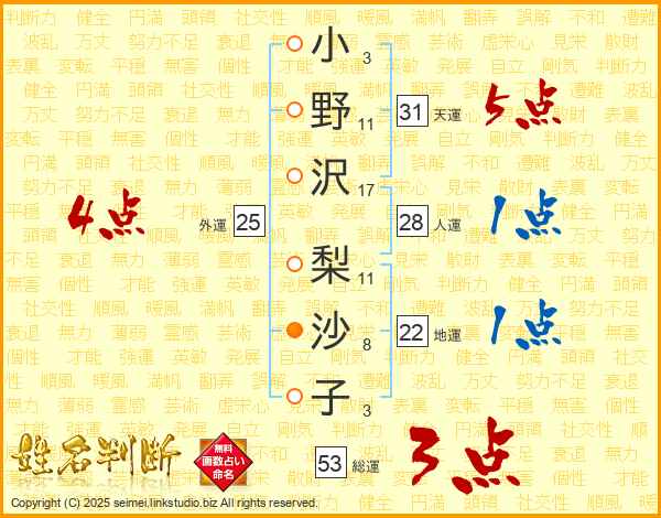 小(3画)野(11画)沢(17画) 梨(11画)沙(8画)子(3画)