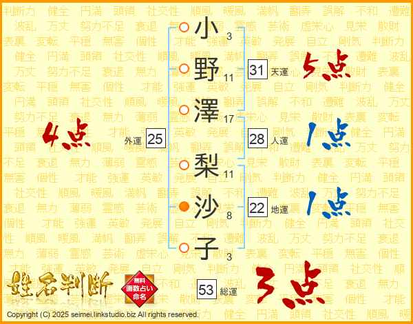 小(3画)野(11画)澤(17画) 梨(11画)沙(8画)子(3画)