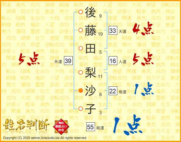後(9画)藤(19画)田(5画) 梨(11画)沙(8画)子(3画)