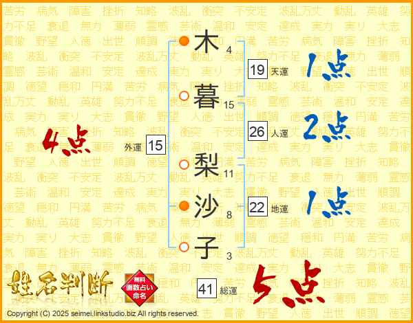 木(4画)暮(15画) 梨(11画)沙(8画)子(3画)