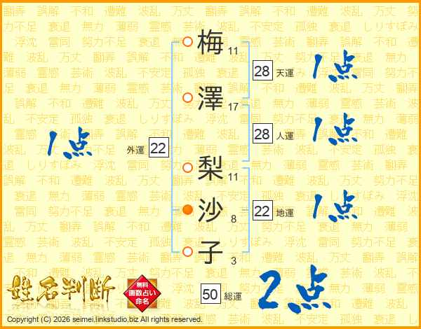 梅(11画)澤(17画) 梨(11画)沙(8画)子(3画)