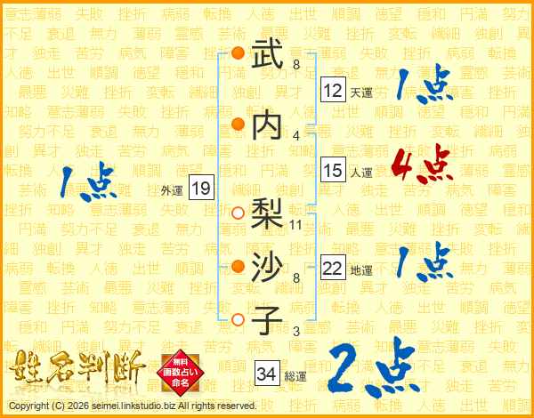 武(8画)内(4画) 梨(11画)沙(8画)子(3画)