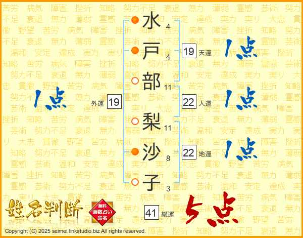 水(4画)戸(4画)部(11画) 梨(11画)沙(8画)子(3画)