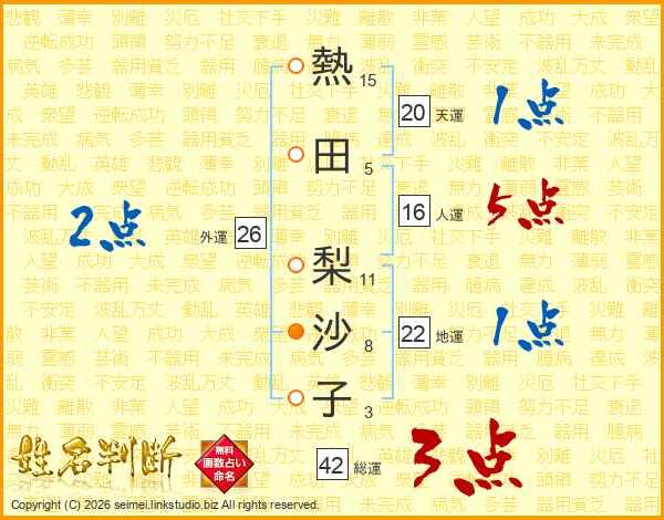 熱(15画)田(5画) 梨(11画)沙(8画)子(3画)