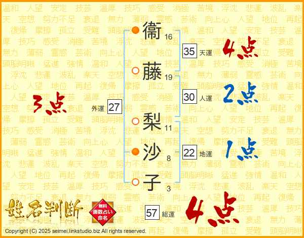 衞(16画)藤(19画) 梨(11画)沙(8画)子(3画)