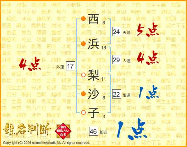 西(6画)浜(18画) 梨(11画)沙(8画)子(3画)