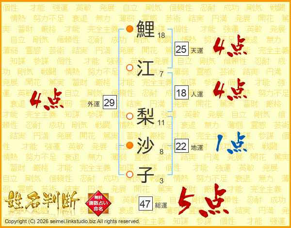 鯉(18画)江(7画) 梨(11画)沙(8画)子(3画)