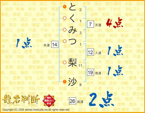 と(2画)く(1画)み(3画)つ(1画) 梨(11画)沙(8画)
