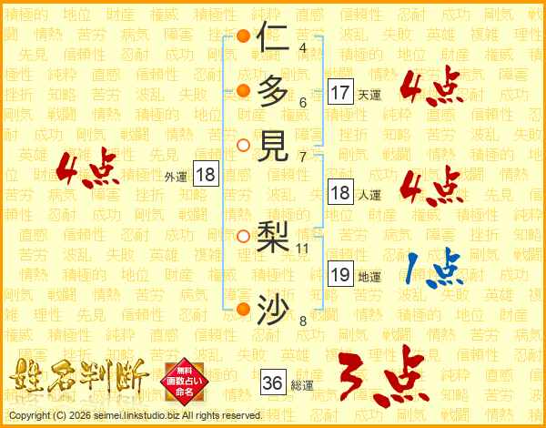 仁(4画)多(6画)見(7画) 梨(11画)沙(8画)