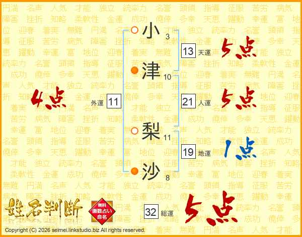 生活面を象徴する運勢です。外部から受ける影響力を表し、結婚運、家庭運や職場、環境への順応性を表します。総運から人運を引いた画数。姓や名が1文字の場合を除く。