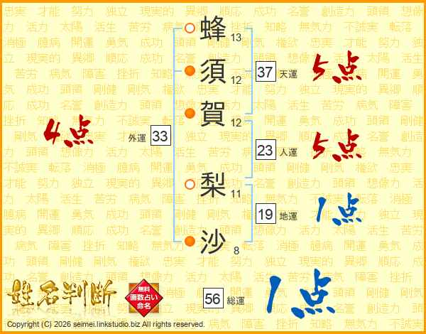 蜂(13画)須(12画)賀(12画) 梨(11画)沙(8画)