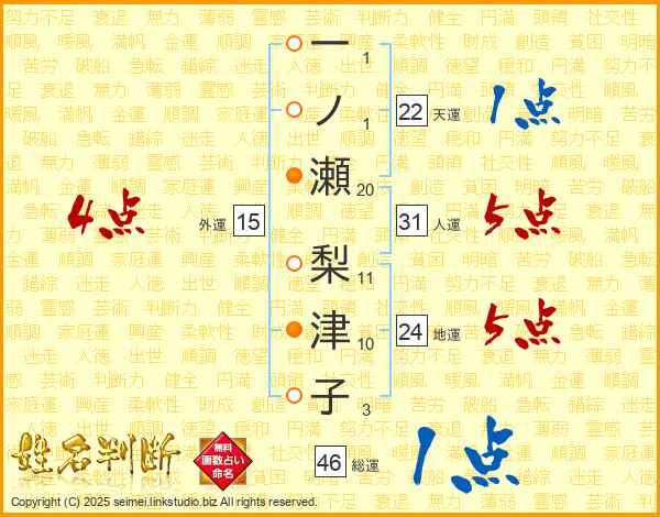 一(1画)ノ(1画)瀬(20画) 梨(11画)津(10画)子(3画)