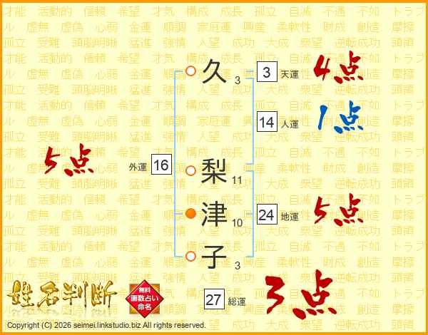 生活面を象徴する運勢です。外部から受ける影響力を表し、結婚運、家庭運や職場、環境への順応性を表します。総運から人運を引いた画数。姓や名が1文字の場合を除く。