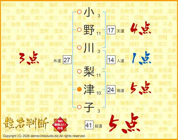 小(3画)野(11画)川(3画) 梨(11画)津(10画)子(3画)