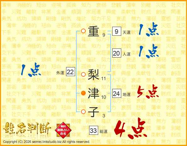 生活面を象徴する運勢です。外部から受ける影響力を表し、結婚運、家庭運や職場、環境への順応性を表します。総運から人運を引いた画数。姓や名が1文字の場合を除く。