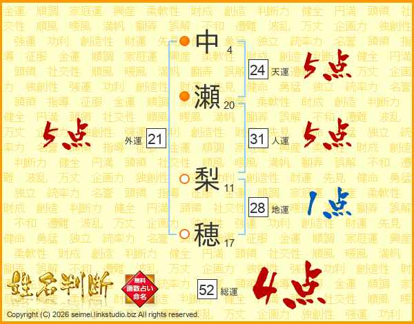 中(4画)瀬(20画) 梨(11画)穂(17画)