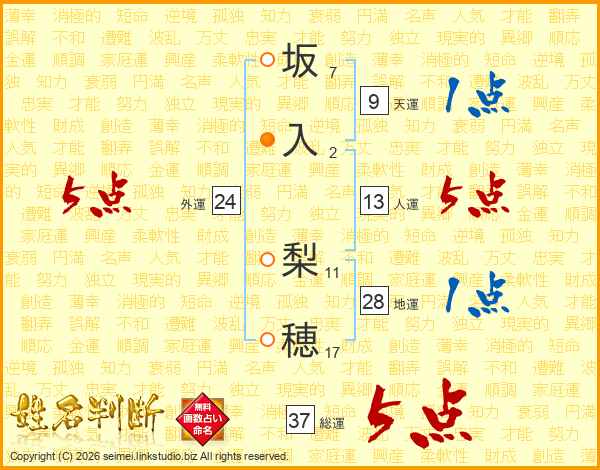 坂(7画)入(2画) 梨(11画)穂(17画)