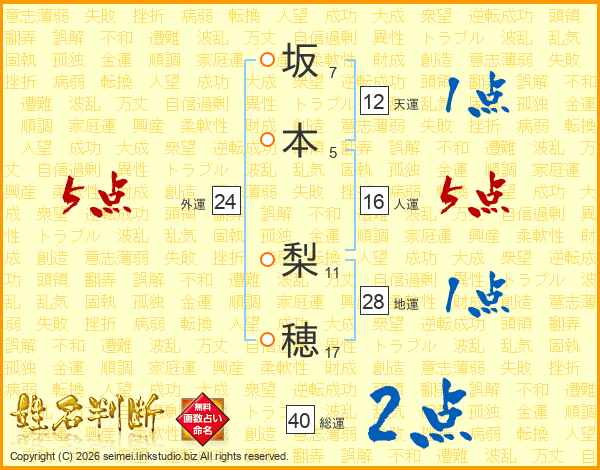 坂(7画)本(5画) 梨(11画)穂(17画)