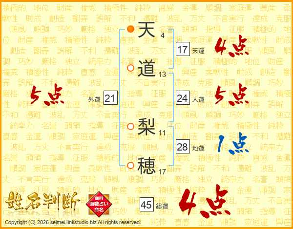 生活面を象徴する運勢です。外部から受ける影響力を表し、結婚運、家庭運や職場、環境への順応性を表します。総運から人運を引いた画数。姓や名が1文字の場合を除く。