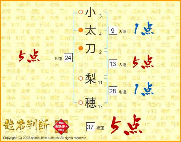 小(3画)太(4画)刀(2画) 梨(11画)穂(17画)