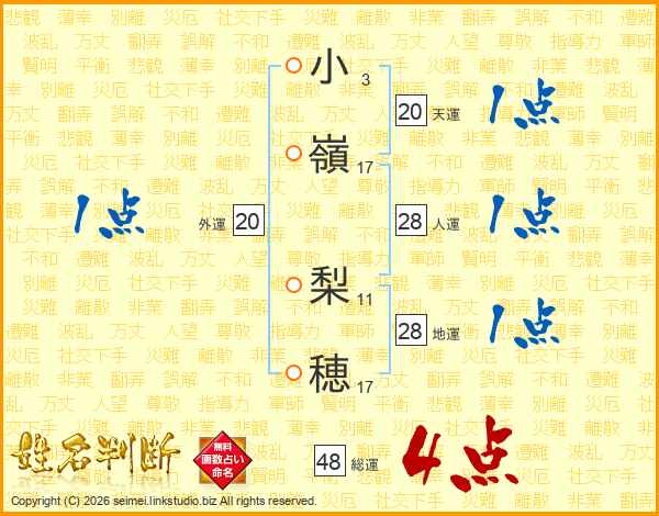 小(3画)嶺(17画) 梨(11画)穂(17画)